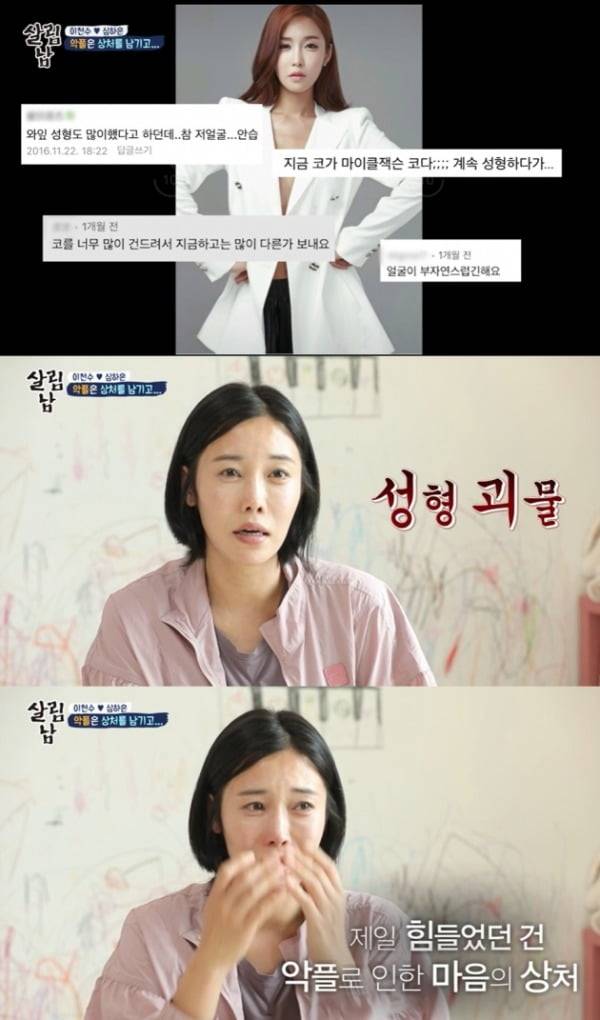 성형의 부작용으로 심하은의 화려한 얼굴은 사라졌다. 가장 속상한 사람은 본인이지만 그보다 더 상처를 주는 건 악플러들의 악플. 심하은에게 붙은 악플러들은 '코와 입이 일자'라고 악한 댓글을 달며 '성괴(성형괴물)'이라고 그를 괴롭혔다.