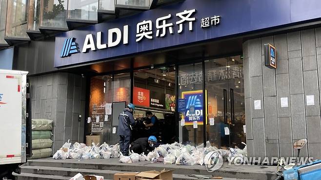 (상하이=연합뉴스) 차대운 특파원 = 29일 코로나19 확산으로 봉쇄된 중국 상하이 도심의 한 슈퍼마켓 앞에 고객들에게 배달될 식료품 꾸러미가 쌓여 있다. 봉쇄가 막바지 단계에 접어들며 많은 슈퍼마켓들이 영업을 재개하고 있지만 아직 오프라인 영업 허가를 받은 곳은 드물다. 2022.5.29