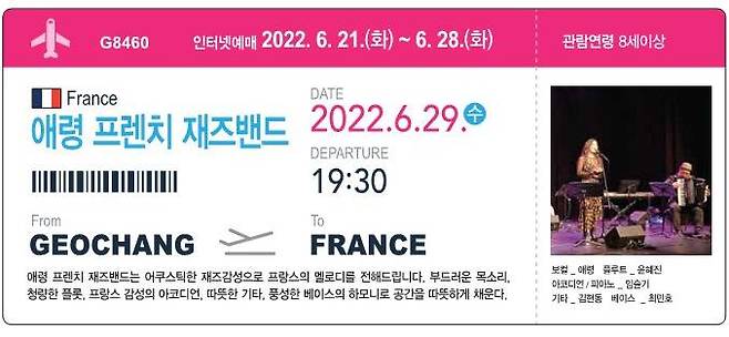 마지막 공연으로는 2022년 공모사업에 선정된 한국문화예술회관연합회 민간예술단체 우수 공연프로그램으로, 6월29일 오후 7 30분에 2022 거창국제공항 ‘애령 프렌치밴드’ 공연이 펼쳐진다.