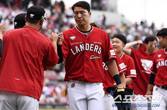 2022 KBO리그 KIA 타이거즈와 SSG 랜더스의 경기가 29일 광주기아챔피언스필드에서 열렸다. 경기에서 승리한 SSG 선수들이 기뻐하고 있다. 광주=박재만 기자 pjm@sportschosun.com/2022.05.29/