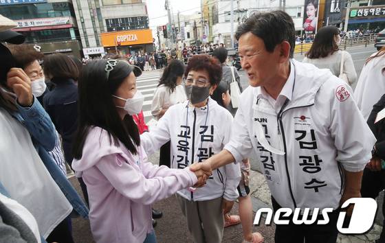 (제주=뉴스1) 오현지 기자 = 김광수 제주도교육감 후보가 29일 오후 제주시청 인근에서 부인 김순선씨와 함께 시민들과 인사를 나누고 있다. 2022.5.29/뉴스1