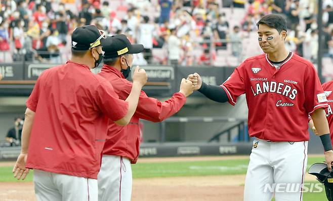 [광주=뉴시스] 류형근 기자 = 29일 오후 광주 북구 광주-기아챔피언스필드에서 열린 2022프로야구 KIA 타이거즈 대 SSG 랜더스의 경기, SSG가 9-7 승리를 거두고 하이파이브 하고 있다. 2022.05.29. hgryu77@newsis.com