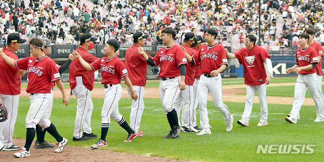 [광주=뉴시스] 류형근 기자 = 29일 오후 광주 북구 광주-기아챔피언스필드에서 열린 2022프로야구 KIA 타이거즈 대 SSG 랜더스의 경기, SSG가 9-7 승리를 거두고 하이파이브 하고 있다. 2022.05.29. hgryu77@newsis.com