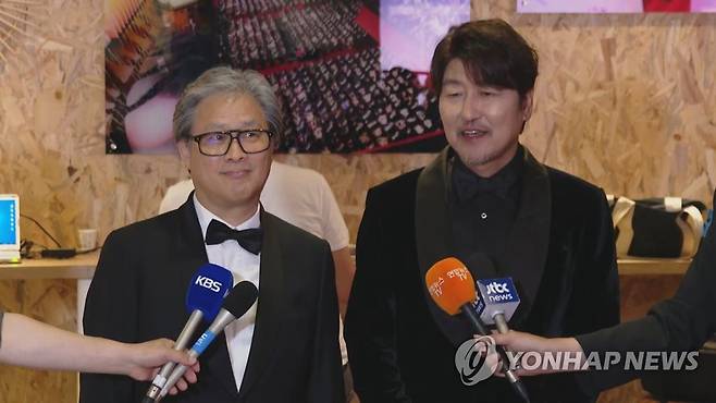보도진 질문에 답하는 박찬욱 감독과 배우 송강호