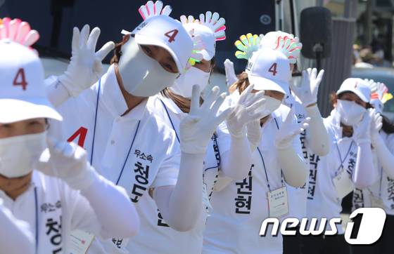 (청도=뉴스1) 정우용 기자 = 29일 경북 청도 삼거리에서 열린 무소속 박권현 청도군수 후보 유세에서 선거운동원들이 율동을 하며 4번 지지를 호소하고 있다. 2022.5.29/뉴스1