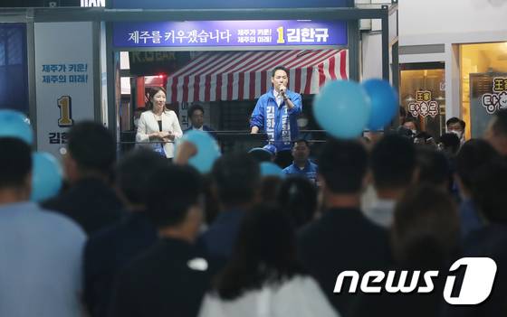 (제주=뉴스1) 오현지 기자 = 김한규 제주시을 국회의원 보궐선거 후보가 29일 오후 제주시청 인근에서 진행한 총력 유세에서 오영훈 지지를 호소하고 있다. 2022.5.29/뉴스1