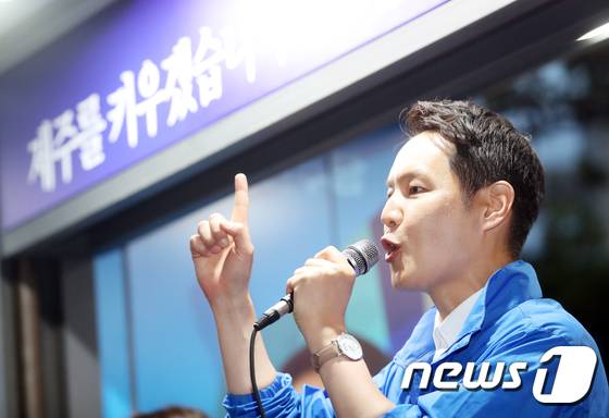 (제주=뉴스1) 오현지 기자 = 김한규 제주시을 국회의원 보궐선거 후보가 29일 오후 제주시청 인근에서 진행한 총력 유세에서 지지를 호소하고 있다. 2022.5.29/뉴스1