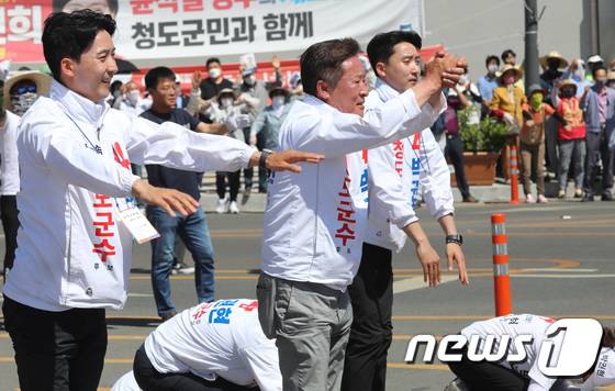 (청도=뉴스1) 정우용 기자 = 29일 경북 청도 삼거리에서 열린 무소속 박권현 청도군수 후보 유세에서 박 후보가 가족들과 함께 큰 절을 하고 있다. 박 후보는 "진심이 공약이다. 청도를 위한 저의 진심을 알아달라"고 읍소했다. 2022.5.29/뉴스1