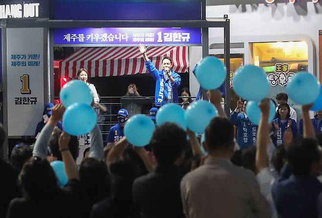 [제주=뉴시스] 우장호 기자 = 김한규 더불어민주당 제주시을 국회의원 보궐선거 후보가 29일 오후 제주시청 인근 거리에서 총력유세를 열어 지지를 호소하고 있다. 2022.05.29. woo1223@newsis.com