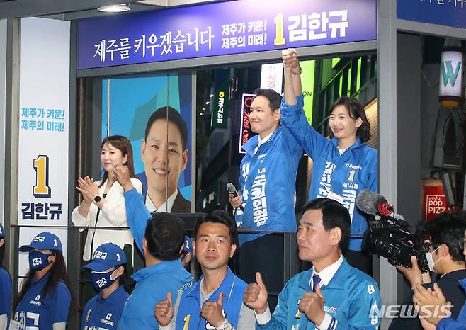 [제주=뉴시스] 우장호 기자 = 김한규 더불어민주당 제주시을 국회의원 보궐선거 후보와 부인 장보은씨가 29일 오후 제주시청 인근 거리에서 총력유세를 열어 유권자들에게 인사하고 있다. 2022.05.29. woo1223@newsis.com