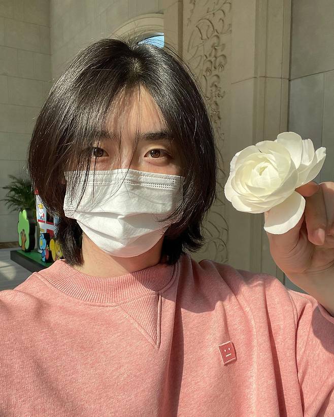 사진 속 이종석은 핑크색의 맨투맨 상의를 입은 채고 꽃을 한송이 들고 있다.