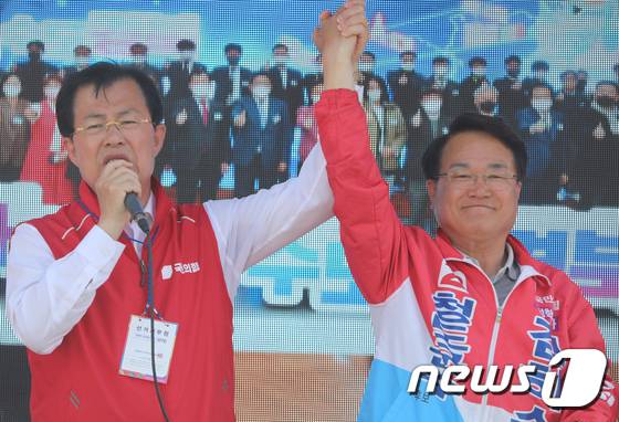 (청도=뉴스1) 정우용 기자 = 29일 경북 청도 삼거리에서 열린 국민의힘 김하수 청도군수 후보 유세에서 이만희 의원이 김 후보의 손을 들어 올리며 지지를 호소하고 있다. 2022.5.29/뉴스1