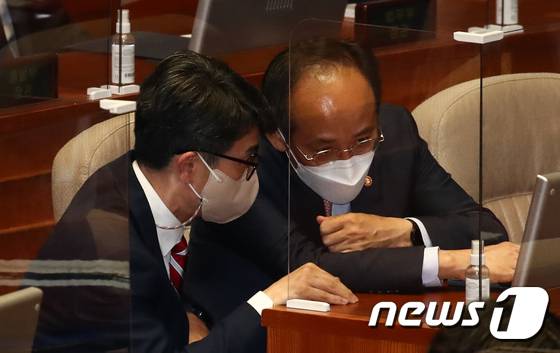 (서울=뉴스1) 허경 기자 = 추경호 경제부총리 겸 기획재정부 장관이 29일 국회에서 열린 본회의에 참석해 관계자와 대화하고 있다. (공동취재) 2022.5.29/뉴스1