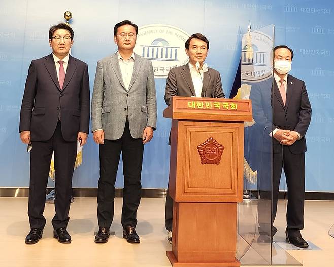 [서울=뉴시스] 김경목 기자 = 29일 오후 김진태 국민의힘 강원도지사 후보가 서울 국회 소통관에서 윤석열 대통령의 제1호 공약 '강원특별자치도 설치 등에 관한 특별법' 본회의 통과를 호소하고 있다. 왼쪽부터 국민의힘 권성동(강릉) 원내대표, 유상범(홍천·횡성·영월·평창) 국회의원, 한기호(춘천·철원·화천·양구을) 사무총장. (사진=김진태 후보 제공) 2022.05.29. photo@newsis.com