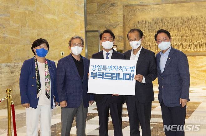 [서울=뉴시스] 김경목 기자 = 29일 오후 왼쪽부터 더불어민주당 서영교 국회 행정안전위원회 위원장, 송기헌(강원 원주을) 국회의원, 이광재 강원도지사 후보, 최문순 강원도지사, 허영(강원 춘천·철원·화천·양구갑) 국회의원이 서울 국회에서 '강원특별자치도 설치 등에 관한 특별법' 본회의 통과를 호소하고 있다. (사진=이광재 후보 제공) 2022.05.29. photo@newsis.com