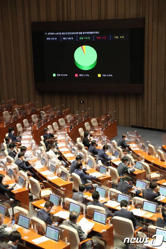 (서울=뉴스1) 허경 기자 = 29일 서울 여의도 국회에서 열린 397회(임시회) 제4차 본회의에서 '공무원의 노동조합 설립 및 운영 등에 관한 법률 일부개정법률안'이 재적 292인 중 재석 188인, 찬성 176인, 반대 4인, 기권 8인으로 통과 되고 있다. (공동취재) 2022.5.29/뉴스1