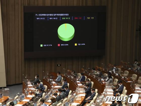 (서울=뉴스1) 허경 기자 = 29일 국회에서 열린 제 397회 4차 본회의에서 산업재해보상보험법 일부개정 법률이 통과 되고 있다. (공동취재) 2022.5.29/뉴스1