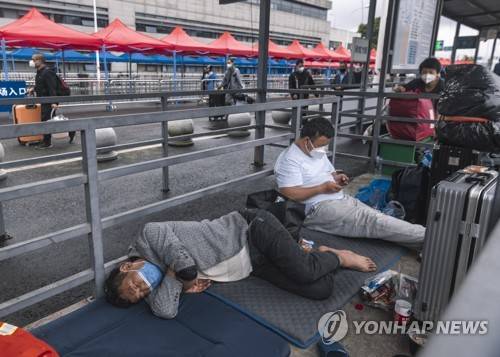 epa09984109 People camp in front of the Hongqiao railway station while waiting for their trains, amid the ongoing COVID-19 lockdown in Shanghai, China, 29 May 2022. Shanghai city reported 29 locally transmitted COVID-19 cases and 93 local asymptomatic infections, according to the Shanghai Health Commission on 29 May 2022. On 18 May, the Shanghai Police issued a notice that people who needed to leave the city must apply for permits. The pandemic-hit cty is facing a mass exodus due to the COVID-19 strict lockdown. People are fleeing the city despite the government asking citizens only to leave if it's necessary. EPA/ALEX PLAVEVSKI