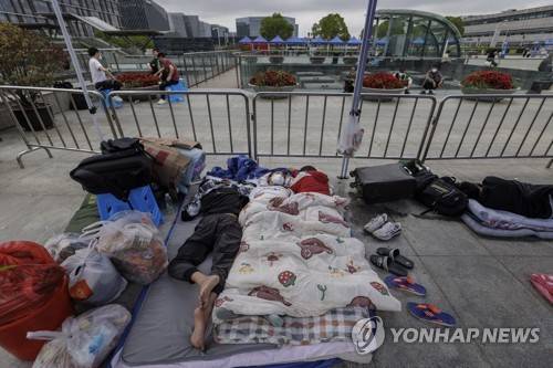 epa09984113 People camp in front of the Hongqiao railway station while waiting for their trains, amid the ongoing COVID-19 lockdown in Shanghai, China, 29 May 2022. Shanghai city reported 29 locally transmitted COVID-19 cases and 93 local asymptomatic infections, according to the Shanghai Health Commission on 29 May 2022. On 18 May, the Shanghai Police issued a notice that people who needed to leave the city must apply for permits. The pandemic-hit cty is facing a mass exodus due to the COVID-19 strict lockdown. People are fleeing the city despite the government asking citizens only to leave if it's necessary. EPA/ALEX PLAVEVSKI