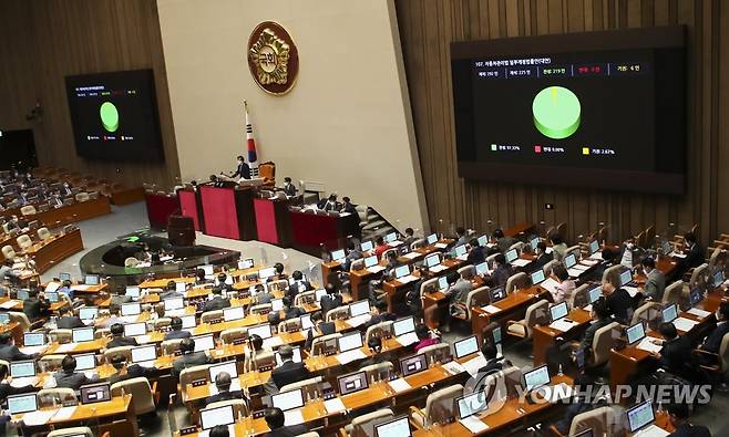 (서울=연합뉴스) 하사헌 기자 = 29일 국회에서 열린 제397회 4차 본회의에서 자동차 관리법 일부개정 법률안이 통과되고 있다. 2022.5.29 [국회사진기자단]