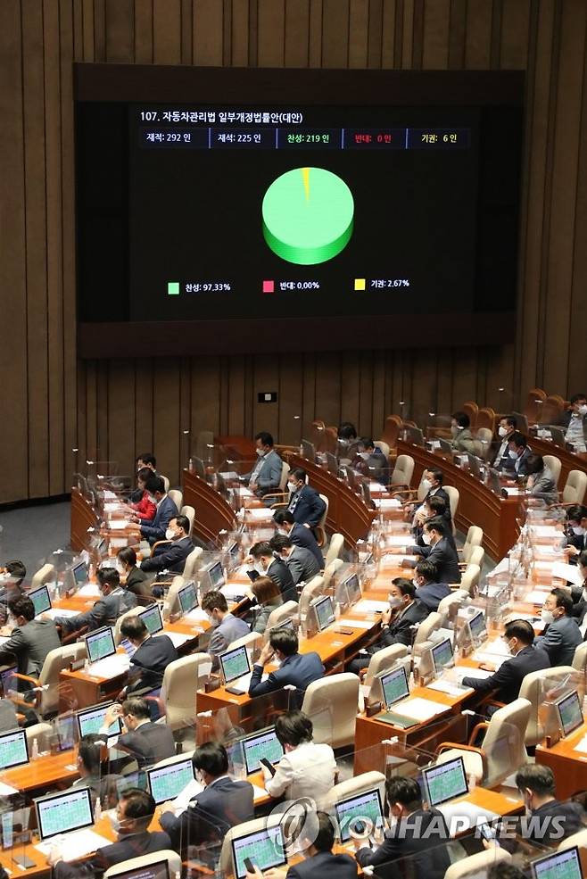 (서울=연합뉴스) 하사헌 기자 = 29일 국회에서 열린 제397회 4차 본회의에서 자동차 관리법 일부개정 법률안이 통과되고 있다. 2022.5.29 [국회사진기자단]