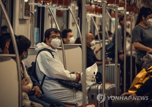 epa09984167 A man in protective gear rides in a subway train towards Hongqiao railway station, amid the ongoing COVID-19 lockdown in Shanghai, China, 29 May 2022. Shanghai city reported 29 locally transmitted COVID-19 cases and 93 local asymptomatic infections, according to the Shanghai Health Commission on 29 May 2022. On 18 May, the Shanghai Police issued a notice that people who needed to leave the city must apply for permits. The pandemic-hit cty is facing a mass exodus due to the COVID-19 strict lockdown. People are fleeing the city despite the government asking citizens only to leave if it's necessary. EPA/ALEX PLAVEVSKI