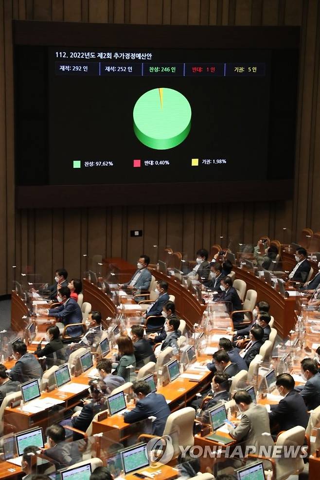 (서울=연합뉴스) 하사헌 기자 = 29일 서울 여의도 국회에서 열린 397회(임시회) 제4차 본회의에서 '2022년도 제2회 추가경정예산안'이 통과되고 있다. 2022.5.29 [국회사진기자단]