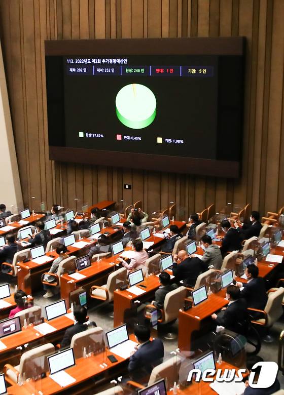 (서울=뉴스1) 허경 기자 = 29일 서울 여의도 국회에서 열린 397회(임시회) 제4차 본회의에서 '2022년도 제2회 추가경정예산안'이 재적 292인 중 재석 252인, 찬성 246인, 반대 1인, 기권 5인으로 통과 되고 있다. (공동취재) 2022.5.29/뉴스1