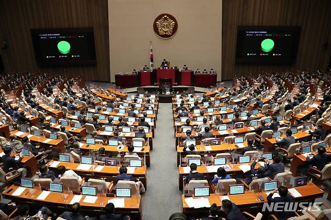 [서울=뉴시스] 김선웅 기자 = 29일 서울 여의도 국회에서 열린 397회(임시회) 제4차 본회의에서 '2022년도 제2회 추가경정예산안'이 재적 292인 중 재석 252인, 찬성 246인, 반대 1인, 기권 5인으로 통과되고 있다. (공동취재사진) 2022.05.29. photo@newsis.com