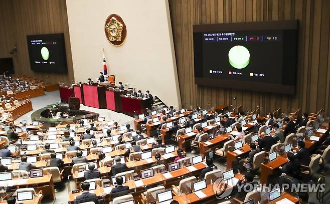 (서울=연합뉴스) 하사헌 기자 = 29일 서울 여의도 국회에서 열린 397회(임시회) 제4차 본회의에서 '2022년도 제2회 추가경정예산안'이 통과되고 있다. 2022.5.29 [국회사진기자단]