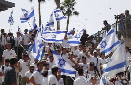 epa09984208 Israeli right wing protesters carry Israeli flags during the Israeli right-wing 'Flag March' next to the Damascus gate of Jerusalem's Old City, Jerusalem, 29 May 2022. The annual right-wing Israeli 'Flag March' celebrating the Jerusalem Day has long been viewed by Palestinians as a provocation. Large number of Israeli police forces have been deployed in the Old city of Jerusalem and Palestinian counter protests are expected to take place in the Gaza City and West Bank. EPA/ATEF SAFADI