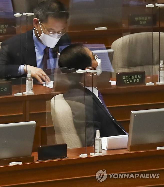 (서울=연합뉴스) 하사헌 기자 = 29일 서울 여의도 국회에서 열린 397회(임시회) 제4차 본회의에서 한덕수 국무총리가 법안 통과를 알리는 전광판을 바라보고 있다. 2022.5.29 [국회사진기자단]