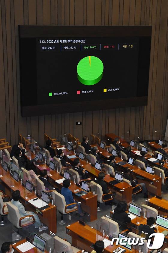 (서울=뉴스1) 허경 기자 = 29일 서울 여의도 국회에서 열린 본회의에서 2022년도 제2차 추가경정예산안이 가결되고 있다. (공동취재) 2022.5.29/뉴스1
