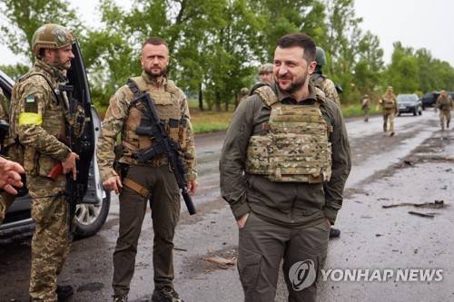 epa09984246 A handout photo made available by the Ukrainian Presidential Press Service shows Ukrainian President Volodymyr Zelensky (R) meeting with Ukrainian servicemen during his visit to the Kharkiv region, Ukraine, 29 May 2022, amid the Russian invasion. According to the Ukrainian presidential office, Zelensky visited the frontline positions in the east of the country and presented state awards to the military during a working trip to the Kharkiv region. On 24 February, Russian troops invaded Ukrainian territory starting a conflict that has provoked destruction and a humanitarian crisis. EPA/UKRAINIAN PRESIDENTIAL PRESS SERVICE HANDOUT -- MANDATORY CREDIT: UKRAINIAN PRESIDENTIAL PRESS SERVICE -- HANDOUT EDITORIAL USE ONLY/NO SALES