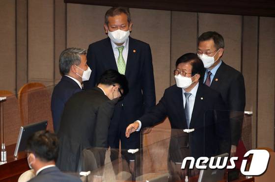 (서울=뉴스1) 허경 기자 = 박병석 국회의장이 29일 오후 서울 여의도 국회에서 열린 본회의를 마친 후 국무위원들과 인사를 나누고 있다. (공동취재) 2022.5.29/뉴스1