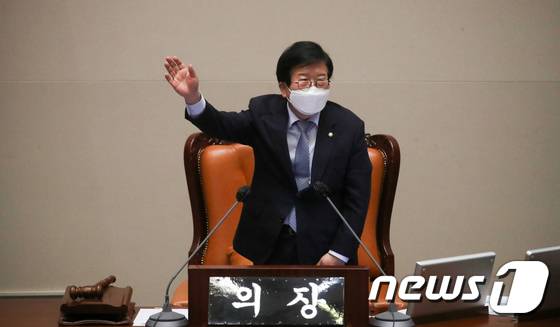 (서울=뉴스1) 허경 기자 = 박병석 국회의장이 29일 서울 여의도 국회에서 열린 의장 임기 중 마지막 본회의를 마친 후 손을 흔들며 인사를 하고 있다. (공동취재) 2022.5.29/뉴스1