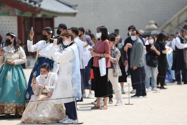 한복을 입은 외국인 관광객 등이 29일 서울 종로구 경복궁에서 휴대전화와 카메라로 수문장 교대식을 촬영하고 있다. 다음 달 1일부터 코로나19 방역을 위해 중단했던 관광비자 발급이 재개돼 외국인 관광객이 크게 늘어날 것으로 전망된다. 연합뉴스