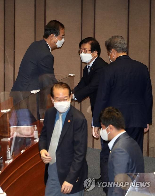 한덕수 총리와 인사 나누는 박병석 국회의장