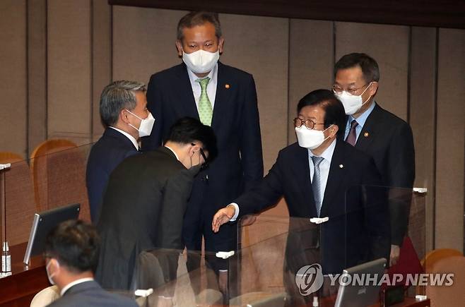 (서울=연합뉴스) 하사헌 기자 = 박병석 국회의장이 29일 오후 서울 여의도 국회에서 열린 본회의를 마친 후 국무위원들과 인사를 나누고 있다. 2022.5.29 [국회사진기자단]