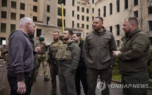 epa09984285 A handout photo made available by the Ukrainian Presidential Press Service shows Ukrainian President Volodymyr Zelensky (C-L) speaking with Kharkiv's Mayor Igor Terekhov (L) during his visit in Kharkiv, Ukraine, 29 May 2022, amid the Russian invasion. According to the Ukrainian presidential office, Zelensky visited the frontline positions in the east of the country and presented state awards to the military during a working trip to the Kharkiv region. On 24 February, Russian troops invaded Ukrainian territory starting a conflict that has provoked destruction and a humanitarian crisis. EPA/UKRAINIAN PRESIDENTIAL PRESS SERVICE HANDOUT -- MANDATORY CREDIT: UKRAINIAN PRESIDENTIAL PRESS SERVICE -- HANDOUT EDITORIAL USE ONLY/NO SALES