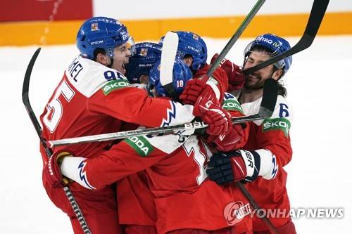 Czech Republic teammates celebrate a goal by Roman Cervenka of the Czech Republic during the Hockey World Championship bronze medal match between Czech Republic and USA in Tampere, Finland, on Sunday, May 29, 2022. (AP Photo/Martin Meissner)