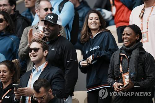Corey, left with cap, and Candi Gauff, right, parents of Coco Gauff of the U.S., watch her fourth round match against Belgium's Elise Mertens at the French Open tennis tournament in Roland Garros stadium in Paris, France, Sunday, May 29, 2022. (AP Photo/Thibault Camus)