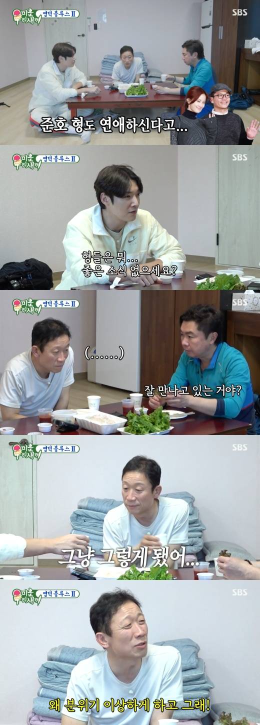 이어 최진혁은 “형들은 뭐 좋은 소식 없으시냐”고 물었다. 이에 임원희는 정석용을 향해 “넌 뭐 어떻게 된 거냐. 잘 만나고 있는 거냐. 헤어졌냐”고 물었다.
