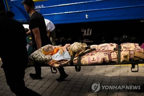 An elderly patient is carried on a stretcher to board a medical evacuation train run by MSF (Doctors Without Borders) at the train station in Pokrovsk, eastern Ukraine, Sunday, May 29, 2022. The train is specially equipped and staffed with medical personnel, and ferries patients from overwhelmed hospitals near the front line, to medical facilities in western Ukraine, far from the fighting. (AP Photo/Francisco Seco)