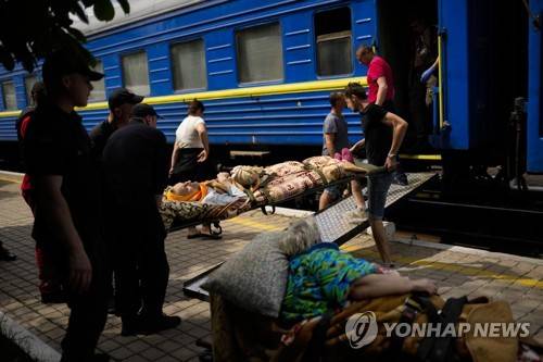 Patients board a medical evacuation train run by MSF (Doctors Without Borders) at the train station in Pokrovsk, eastern Ukraine, Sunday, May 29, 2022. The train is specially equipped and staffed with medical personnel, and ferries patients from overwhelmed hospitals near the front line, to medical facilities in western Ukraine, far from the fighting. (AP Photo/Francisco Seco)