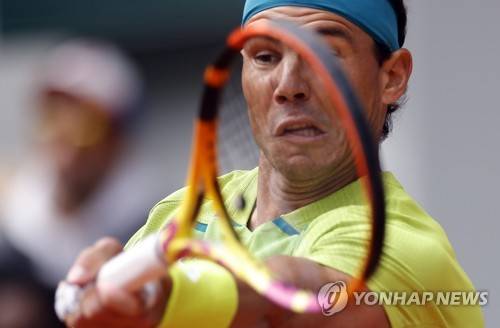 epa09984310 Rafael Nadal of Spain plays Felix Auger-Aliassime of Canada in their men?s fourth round match during the French Open tennis tournament at Roland ?Garros in Paris, France, 29 May 2022. EPA/YOAN VALAT