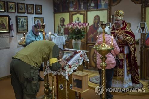 A Ukrainian serviceman attends a Sunday Ukrainian Orthodox mass in Kharkiv, eastern Ukraine, Sunday, May 29, 2022. (AP Photo/Bernat Armangue)