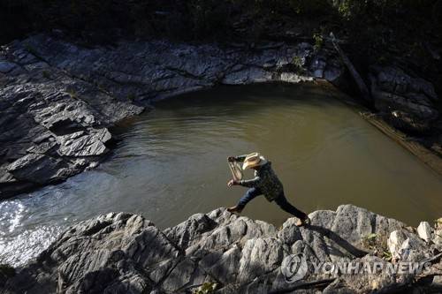 A reveler jumps over rocks beside a river on the farm during celebrations for the religious tradition, "Folia do Divino Espirito Santo" or Feast of the Divine, in the rural area of Pirenopolis, state of Goias, Brazil, Sunday, May 29, 2022. Celebrated in the period of Pentecost, Christian residents celebrate on what they believe is the coming of the Holy Spirit on the apostles of Jesus Christ. (AP Photo/Eraldo Peres)