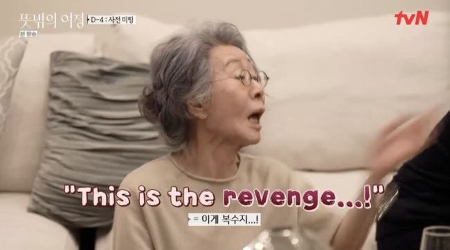 윤여정은 "작년에 '외국인들이 내 이름 발음 못 한다'고 농담을 했는데 큰일이 났다. 이거 복수인거냐"고 통역사 이인아에게 물었다. 이인아는 공감, 윤여정은 "'한국 속담에 '뿌린 대로 거둔다' 그런 말을 할 수 있으면 좋을텐데"라며 걱정했다. 결국 윤여정과 이인아는 함께 "내 이야기를 하는 게 좋을 것 같다"며 영작에 나섰다.