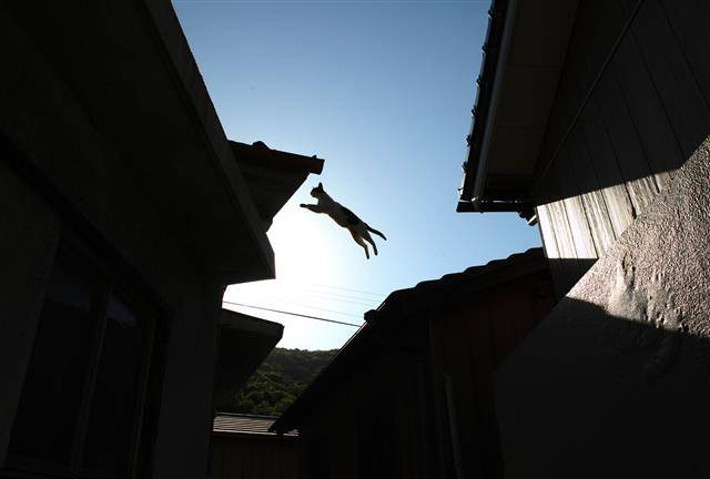 그런데 녀석이 그것을 물고 순식간에 담장으로 뛰어오르더니 풀쩍 지붕으로 올라갔다. 그리고는 이쪽 지붕에서 저쪽 지붕으로 우아하게 날아올랐다. 파란 하늘을 배경으로 새처럼 날아가는 플라잉 캣(flying cat)의 모습은 마치 정지화면처럼 내 눈에 머물렀다.